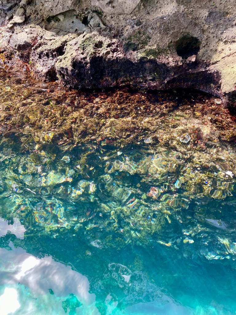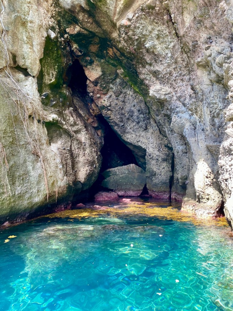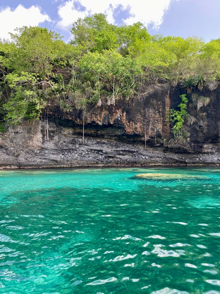 Ensuite, nous avons navigué en direction de la grotte aux chauves-souris. L’eau turquoise qui contraste avec la roche et la noirceur de la cavité rend ce paysage mystérieux et sublime. En s’approchant, on pouvait distinguer les chiroptères et entendre leur petit cri strident. Je vous épargne l’odeur d’excréments présente qui ne les rendait pas moins mignons.